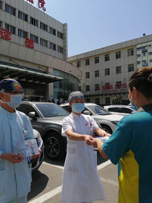 图为投递员为医护人员投送明信片。