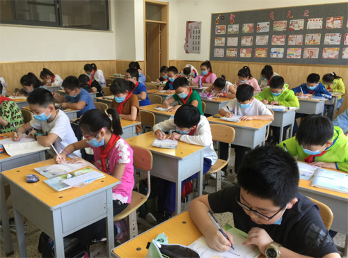 图为小学生在明信片上写寄语。