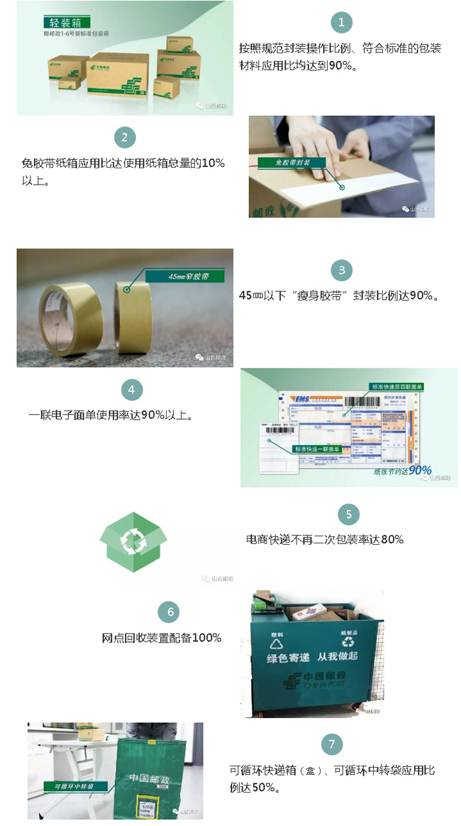 山西邮政积极推进绿色邮政品牌建设,践行绿色邮政建设行动,推动绿色物流、绿色电商、绿色品牌等措施落地,打造“效率、和谐、可持续、负责任”的绿色邮政品牌形象,携手社会各界一起行动,共建天蓝、地绿、水清的美丽中国。