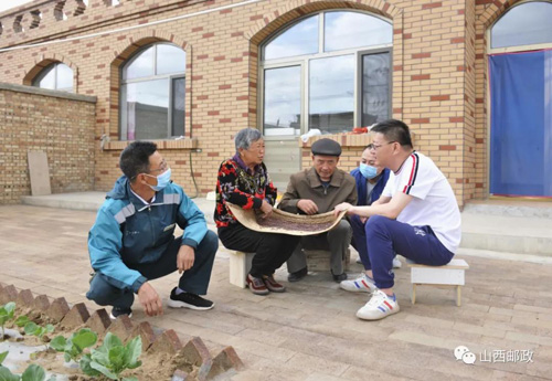 在政府统一修建的易地搬迁安置房里,焦世文与邮政员工商讨致富途径。