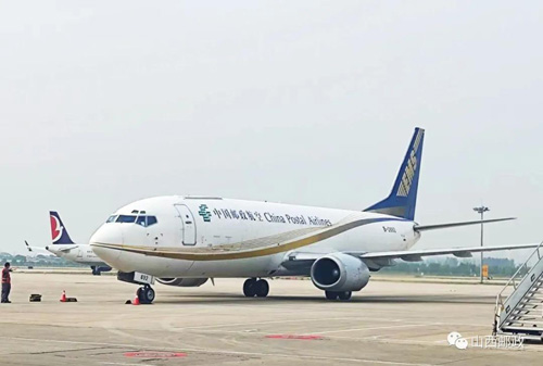 装载着寄往山西各地EMS标快邮件的邮航落停太原武宿机场。