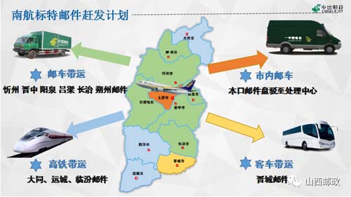大同、运城、临汾方向的邮件,装车赶发高铁运输;晋城方向的邮件赶发客车运输;吕梁、阳泉、晋中方向邮件赶发二干邮车运输。