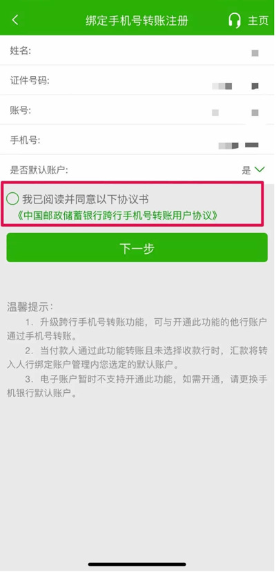 登录邮储银行手机银行-点击我的-设置-选择绑定手机号转账-点击升级支持跨行收款-确认信息并阅读协议-通过短信验证码和人脸识别校验后账户注册成功。