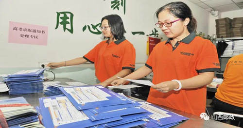 多年来,山西邮政始终将录取通知书寄递作为每年的重点工作之一。每年这个时候也是对他们的大考。山西邮政都要制定专项服务方案,开辟“绿色通道”,专人处理、单独处理、优先处理、主动监控,为各类高等院校、广大考生提供高考录取通知书寄递服务,保障了每一封录取通知书的安全、及时、准确送达,也得到了各级教育主管部门、各院校、广大学生和家长的认可。