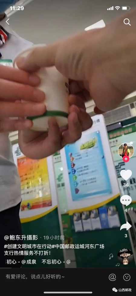 7月30日,今日头条《百姓平台》号发布了一条消息:“一个口罩带着温馨和文明,中国邮政运城河东广场营业所暖心服务一瞥”,对运城市河东广场邮政营业所工作人员的暖心善举给予表扬,其在抖音平台发布的短视频也被多次转发。