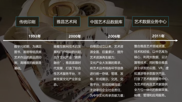 二是分享了雅昌数字化业务的发展历程。为了满足高品质印刷要求,雅昌从传统印刷起步时就开始数字化初期探索,逐步建成了当今全球最大的中国艺术品数据库。他还用生动的图文,形象地展现了雅昌通过平面采集、三维采集、全景采集、AR和VR技术,获得的古籍善本、字画等高清细节图像,生成的古建筑真实场景模拟和立体文物360度鉴赏,以及故宫、国家博物馆等数字展览的呈现。