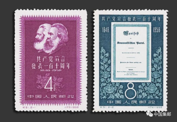 纪51《共产党宣言发表一百十周年》邮票发行于1958年7月1日。第一枚为《马克思和恩格斯侧面像》,他们有着共同宽阔的前额和浓密的胡须,目光深沉、慈祥,令人印象深刻。下方盛开的玫瑰花,寓意两人伟大友谊的结晶——马克思主义学说必将造福人类。第二枚邮票画面为《共产党宣言》1848年德文版封面。《宣言》在蓝绿深底色衬托下,显得醒目、明亮,仿佛天空中的太阳光芒万丈地照耀着全世界无产者前进的路程。画面下方环绕着盛开的牡丹花,象征着《宣言》必将指引人类创造和平与幸福。