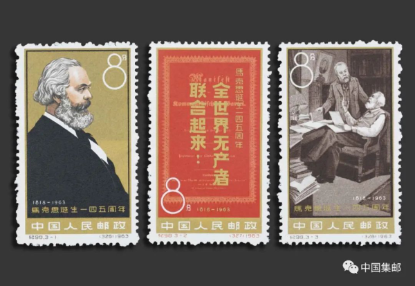纪98《马克思诞生一四五周年》发行于1963年5月5日。第一枚是马克思像,第二枚名为全世界无产者联合起来,背景图案采用《共产党宣言》1848年德文版封面,并以醒目的金色大字,叠印着《宣言》最后一句话:“全世界无产者,联合起来!”这个战斗口号最早由马克思提出。在1847年,经过马克思、恩格斯的努力,正义者同盟改名为共产主义者同盟,为今人所熟知的“全世界无产者,联合起来!”代替了“人人皆兄弟”这个没有阶级观点的口号。第三枚邮票是马克思和恩格斯在一起讨论书稿。恩格斯站在马克思身旁,右手扶着一本书,左手放在椅背上,聚精会神地听着马克思的讲述。人物表情和谐、逼真,很好地展现出两人四十多年的伟大友谊。