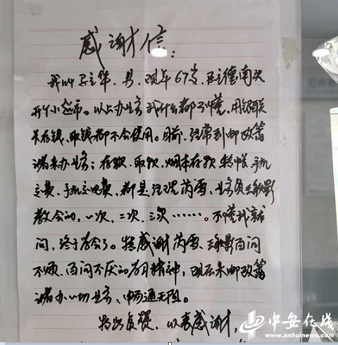 9月22日一大早,邮储银行亳州市立德镇支行刚刚营业,一位老大爷匆匆走进网点大厅,对工作人员说:“你们负责人在吗?”还没等工作人员回话,老大爷接着说:“我是来送感谢信的,感谢你们工作人员不厌其烦的教会我办理各项业务。”边说老人边从口袋里掏出一封手写的感谢信。