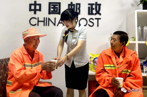 街道是城市的脸面,而默默无闻的环卫工人就是城市的美容师。共建城市文明,需要对环卫工人更多的关爱。为此,全省邮政网点纷纷邀请环卫工人走进网点,纳凉歇脚、饮水休息,用实际行动为他们送上一份关怀和温暖,让网点成为环卫工人获得尊重、获得关爱的“暖心屋”。