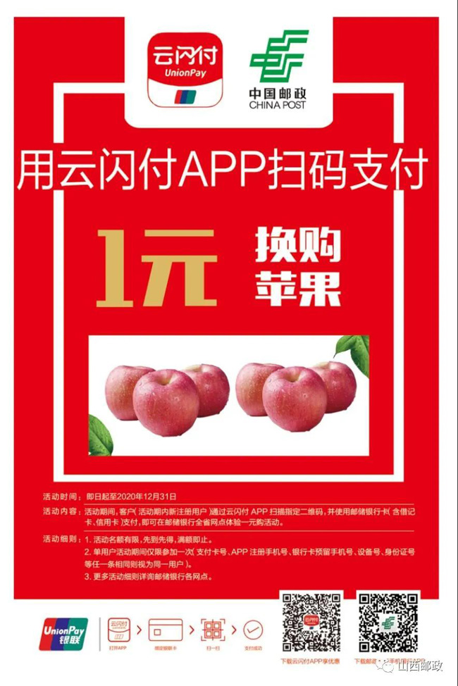 即日起至2020年12月31日,手机下载云闪付APP,新注册账户;云闪付绑定邮政储蓄卡;到我省任一邮政储蓄网点,扫描专属二维码,即可1元领到一箱(6个装)地道的翼城苹果。