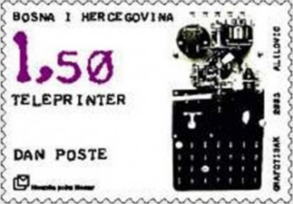 波黑2003年发行“世界邮政日”电传打字机邮票(电传打字机作为电磁电报机的替代品最早出现在20世纪初。)