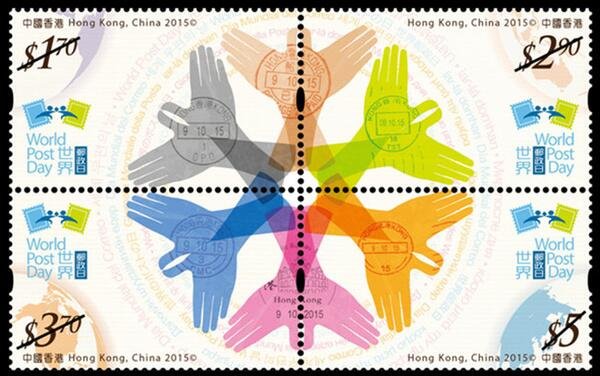 中国香港2015年发行“世界邮政日”邮票(一套四枚,主图以手形排列象征出6只飞翔的和平鸽,配以信函传递及邮政戳记,日戳表达出15年10月9日。)