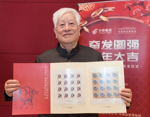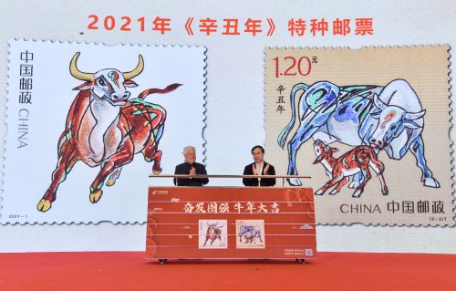 当日, “金牛贺岁” 2021辛丑年生肖邮票展览在北京中国邮政邮票博物馆举行。《辛丑年》特种邮票设计者、艺术家姚钟华接受新华社记者采访,分享关于邮票创作的故事。《辛丑年》特种邮票的设计延续了第四轮生肖邮票的“家国”理念,邮票第一枚“奋发图强”,描绘了雄壮有力、一往无前的奔牛形象。公牛四蹄扬起,昂首向前,目光炯炯,表达出不畏艰险、砥砺前行,为实现中华民族伟大复兴而努力奋斗的寓意。第二枚“牛年大吉”,通过大牛与小牛舐犊情深的温馨画面,向全国人民传递家庭兴旺和谐、团圆美满的美好祝愿。
