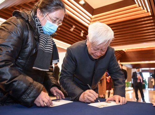 1月5日,《辛丑年》特种邮票设计者、艺术家姚钟华(右)在北京的首发仪式现场为集邮爱好者的《辛丑年》特种邮票首日封签名。新华社记者 李贺 摄