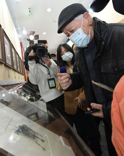 1月5日,《辛丑年》特种邮票设计者、艺术家姚钟华在展厅看到自己于三十多年前为中国邮政《乙丑年》特种邮票绘制的稿样原件时难掩激动情绪。新华社记者 李贺 摄