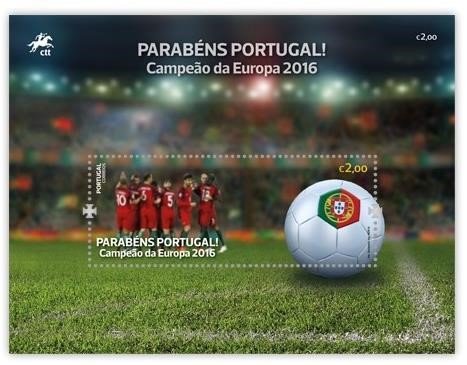 小型张面值2欧元,中间邮票四周的齿孔有2个非常有葡萄牙特色的十字形齿孔,代表葡萄牙的国徽标志。邮票主图上身穿葡萄牙国家队球衣的队员相拥庆祝,但无法分辨具体是哪位球员。这也符合葡萄牙邮政局设计发行该邮票的主要意图:以此纪念为葡萄牙国家队夺冠作出努力的所有现役球员和以往球员,以及全体的工作人员,还有向葡萄牙足球名宿尤西比奥、科卢纳致敬,寓意荣誉属于整个葡萄牙国家队。