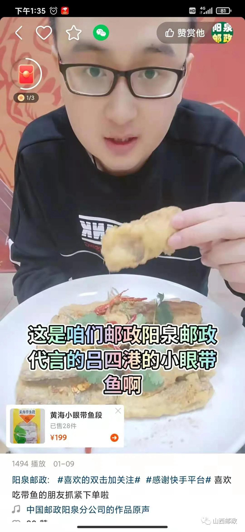 1月下旬起,阳泉邮政陆续开展了5场“年货不打烊,一键送到家”直播活动。直播中,主播通过现场试吃和产品展示的方式,向线上网友介绍了多款精选的当地优质农特产品,不仅让线上客户更直观地了解了家乡特产,引发了对于家乡味道的共鸣,而且可通过直播下单的方式,为家人或自己购买了一份地道的家乡味。