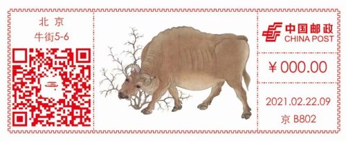 2月22日是辛丑年第一个辛丑日,北京邮政启用了第一枚《五牛图》邮资机彩色宣传戳,并首次尝试邮资机宣传戳产品线上定时寄预约实寄服务。