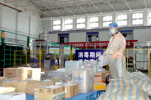 8月5日,在太原国际邮件互换局工作现场,身穿防护服的邮政工作人员,将境外进口邮件平摊在大托盘上,正在用大型雾化消毒机逐一对所有邮件进行消毒。