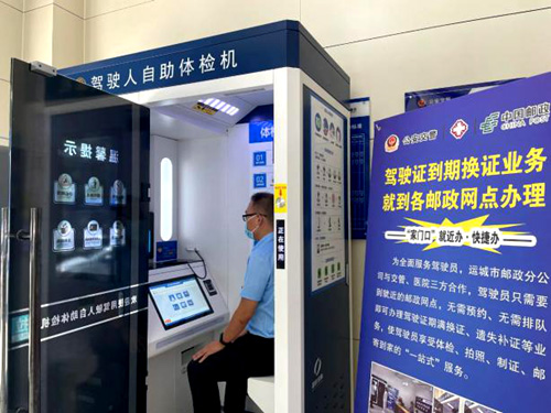 据悉,运城邮政已在全市开通26个“警医邮”网点,其中市区河东广场对面的邮政大厦网点配有“驾驶人自助体验机”,其余网点设立了人工体检服务区,由工作人员协助驾驶人完成体检,医院专业人员远程审核。驾驶人无须现场等候,只需留下自己的地址,邮政工作人员第二天就会上门送证。