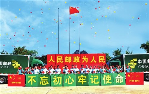 图为江苏省徐州市邮政分公司员工在欢度国庆、喜迎世界邮政日之际表达邮政人“不忘初心、牢记使命”“人民邮政为人民”的共同心声。
