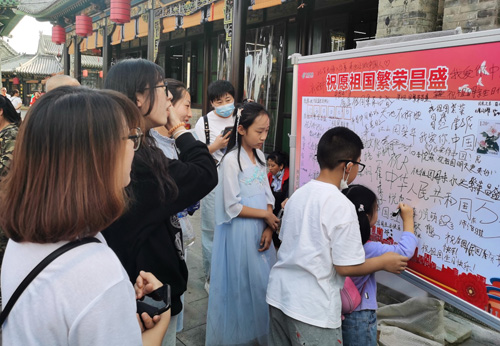 在太原古县城主题邮局,国庆主题信封图样的背景墙吸引了游人的目光,人们纷纷驻足写下自己对祖国的美好心愿。网点还开展了“相约古县城 共寄爱国情”活动,很多孩子为老师、长辈寄出了国庆寄语。同时现场继续销售古县城纪念封和邮折等文创产品,为游人免费加盖古县城十大景点纪念戳。