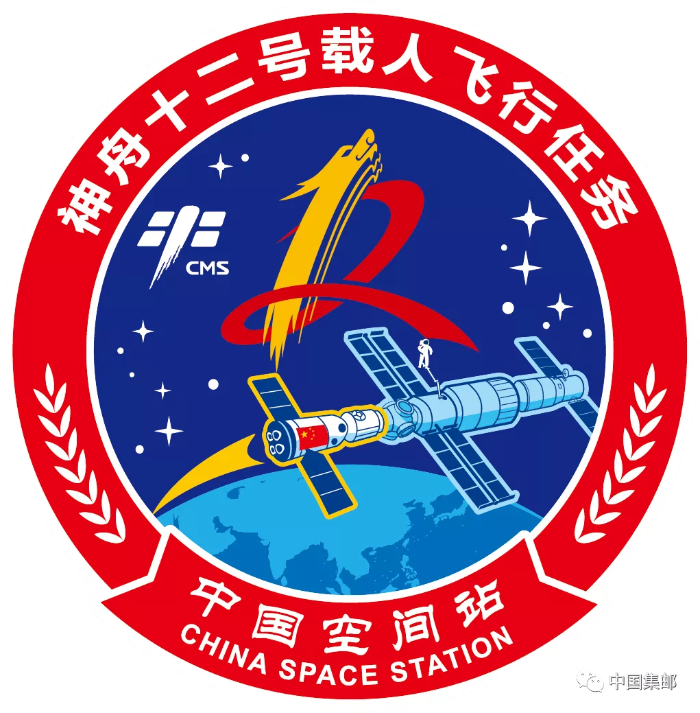神舟十二号载人飞行任务标识整体造型以圆形来表达中国古人“天圆地方”的传统理念。色调以红蓝两色系为主,红色代表中国红以及炽热的宇宙探索之情,蓝色象征浩瀚太空以及科学探索。核心图案为中国“”与红飘组合形成的数字“12”,三条龙以重叠状态出现,从近到远,更具整体感与团结意识。“空间站”、“航天员出舱”、“机械臂”等图案代表了神舟十二号飞船的部分任务背景是深邃的太空,周围的繁星象征着执行历次飞行任务的航天员、中国载人航天标志,以及显示着中国位置的地球局部。橄榄叶象征中国和平发展的方针。