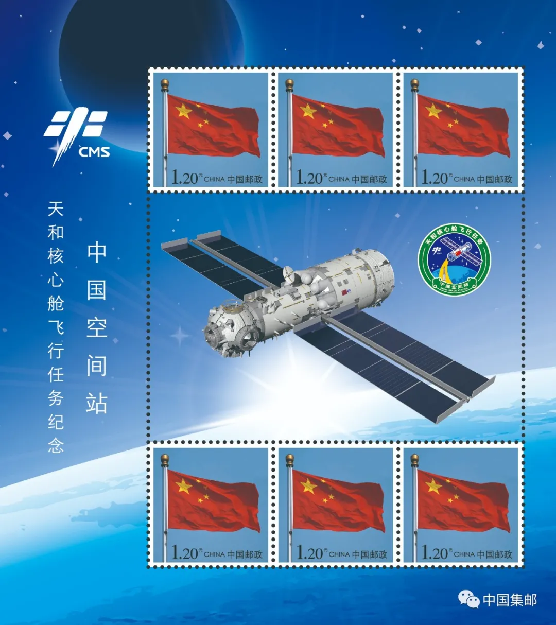 本邮折收录的6枚版国旗主图个性化邮票表现了天和核心舱、天舟二号和神舟十二号飞船组合体画面以及执行任务的三位航天员肖像,完整展现了本次飞行任务。