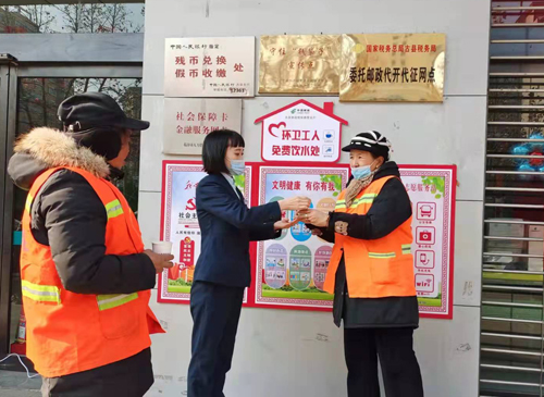 近日,古县邮政分公司积极履行社会责任,开展暖冬公益行动,安排各网点为环卫工人免费提供饮水、藿香正气水、应急医疗包,并为他们提供休息场所,用实际行动为环卫工人送去关爱和温暖,获得环卫工人和广大群众的一致好评。