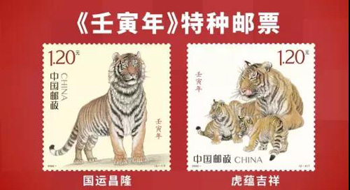虎年生肖邮票一套两枚,第一枚邮票名为“国运昌隆”,描绘了一只气宇轩昂的上山虎形象,矗立远眺、志存高远,传达出国家蒸蒸日上、雄心壮志的含义;第二枚邮票名为“虎蕴吉祥”,描绘了面容温婉的虎妈妈带着两只小虎的温馨场景,寓意儿孙兴旺、家庭美满。