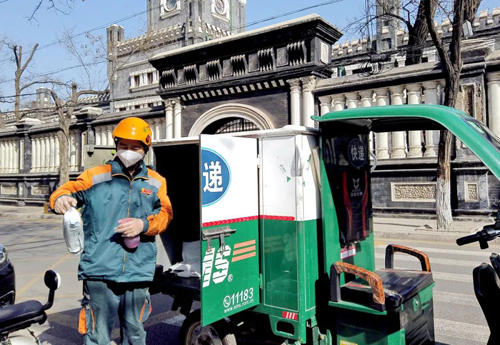 在投递环节,投递人员要在班前班后,对投递车辆进行消杀。为每位投递员配备了消毒喷壶,要求对投递道段上的每个邮件逐件进行六面消杀后,再按址投递到收件人手中。
