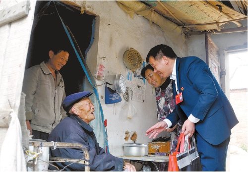 殷勇(右一)到农户家中走访,为老人送去慰问品