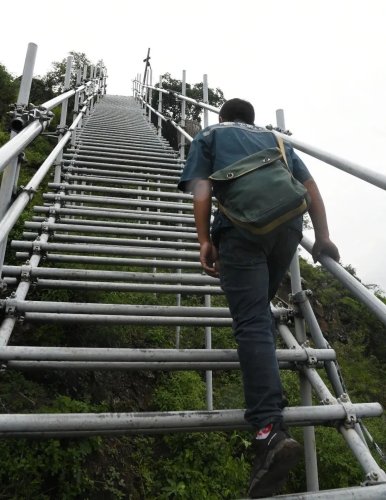 沿着石土混合的台阶而上,一会儿功夫,一段段钢架搭成的钢梯就映入眼帘,只见梯子每一级由2-3根独立的钢管焊接而成,钢管圆圆的,感觉稍不留神很容易踏空和滑倒。