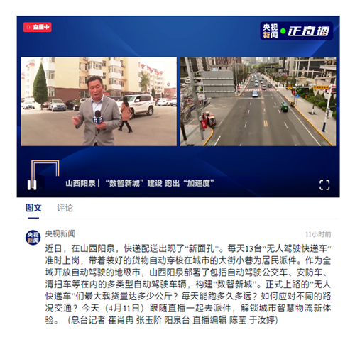 4月11日9点,央视新闻客户端直播平台现场直播了阳泉邮政无人投递车从装车到投递的全过程,直播全程约30分钟,在线观看人数近万人,网友们纷纷为阳泉邮政推进城市数智化建设点赞。