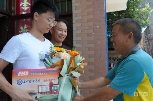 “谭医生,你儿子的录取通知书到啦。”邮车还未停下,喜报声便抢先“进门”,拿起录取通知书后,吴江南捧出一束邮局准备的鲜花。“沙明村考上个大学生不容易,这也是我们的一份心意。”