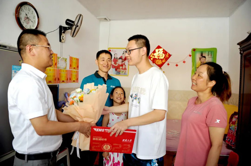 “恭喜你家孩子考上了西南大学。我们企业对每位员工的孩子考上大学都上门表示祝贺。”娄烦县邮政分公司总经理刘军峰为王慧岗一家人送上一捧鲜花。