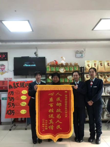 当天下午,马女士办理完其他相关事宜后,就带着礼物来到支局表达感谢,支局长表示,为客户服务是我们应该做的,绝对不能收客户的礼品。马女士被邮政工作人员的专业和真诚所打动,过了两天为支局送上锦旗并再次表示感谢:“这锦旗不足以表达我的感谢之情,以后有钱就认准前甸邮政了!”听到客户口中对邮政的认可与赞美,前甸支局的每一个人心里都十分温暖。