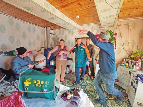 向东南方向行进,在冲乎尔邮政所,哈萨克族营业员、揽投员夫妇正忙碌着打包寄发新鲜、优质的牛羊肉。再往前行,记者一行来到了被誉为“人间仙境”“神的自留地”“中国最美村庄”的禾木村。据禾木主题邮局营业员介绍,2023年,邮政服务游客达110余万人次,抵边村投递量达到了11.7万件。