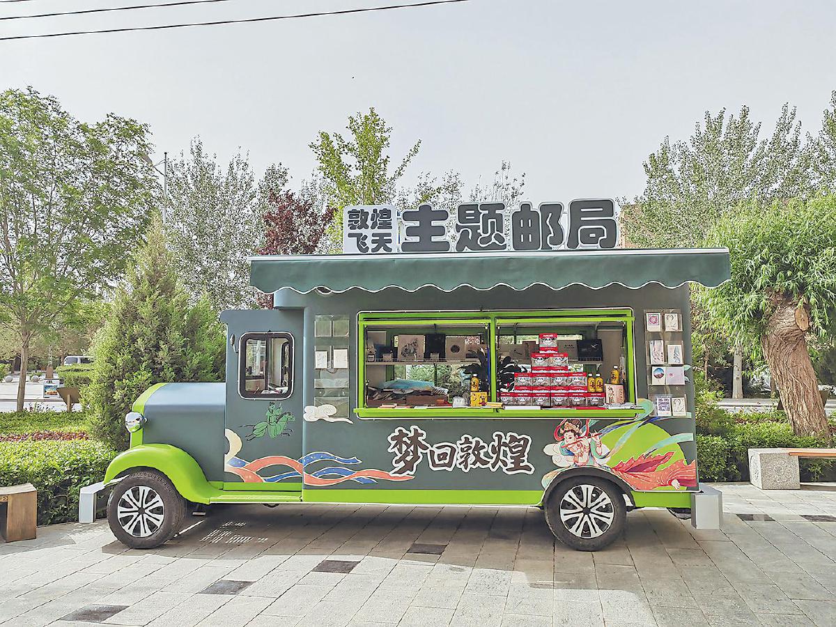 采用街景文化创意的敦煌飞天主题邮局是敦煌市博物馆门口一道亮丽的风景线。