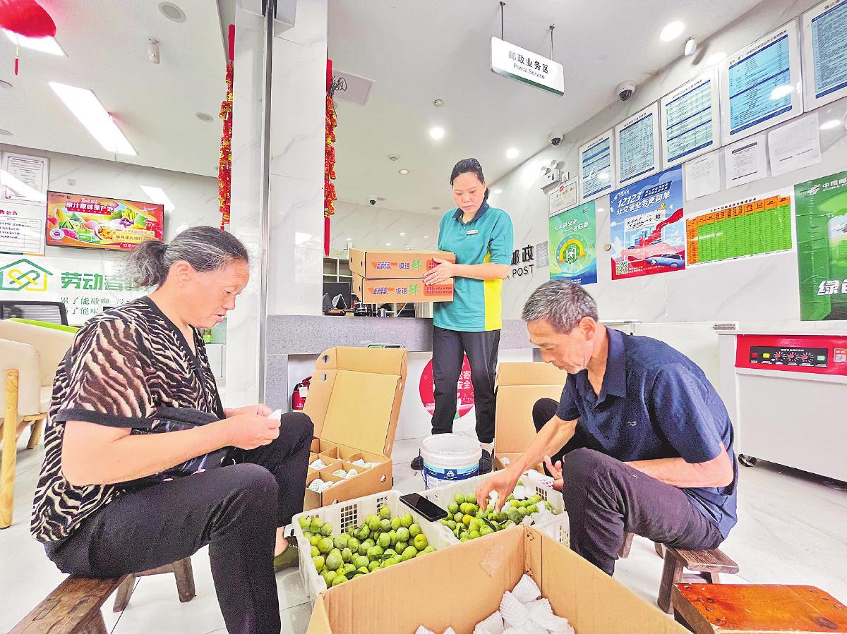 邮政网点为脆李寄递散户提供免费包装服务。□肖婉君 摄