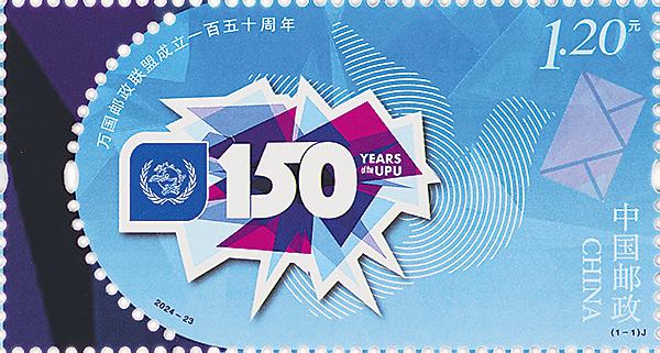 该套邮票一套1枚,以万国邮政联盟150周年标识为画面主体,背景融入线条组成的信鸽图案,寓意邮政网络通达全球,表达了“联系世界、赋能于人”的内涵。画面左侧LOGO白色边缘线条以及“150”文字采用无色荧光工艺,荧光灯下具有较强的视觉冲击力;右侧信封采用烫印工艺,通过覆膜呈现变色效果。该套邮票由蒋蔚设计,责任编辑为温文雅,北京邮票厂有限公司胶印(采用局部烫印)工艺印制。