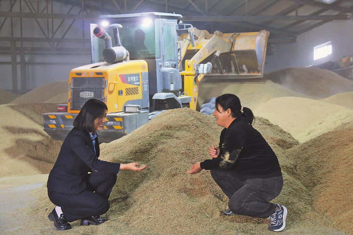 吴志霞向乌鲁木齐市分行客户经理孔阿朵介绍稻谷归仓情况。