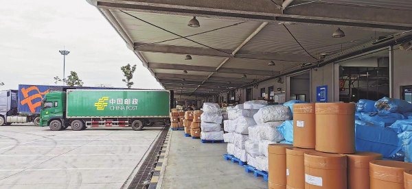 邮车在集运仓装载邮件。