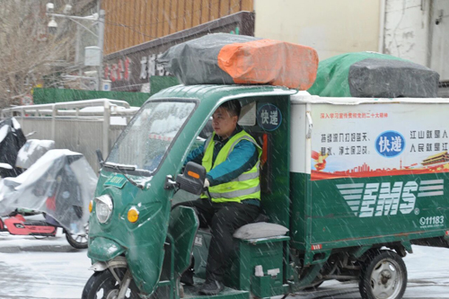 太原市迎泽区新生里揽投部投递员冒雪出班。王蕴伟 摄