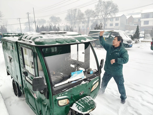 大雪覆盖了太行山深处的陵川县。投递员出班前仔细清理三轮车上的积雪。 张雪琴 摄