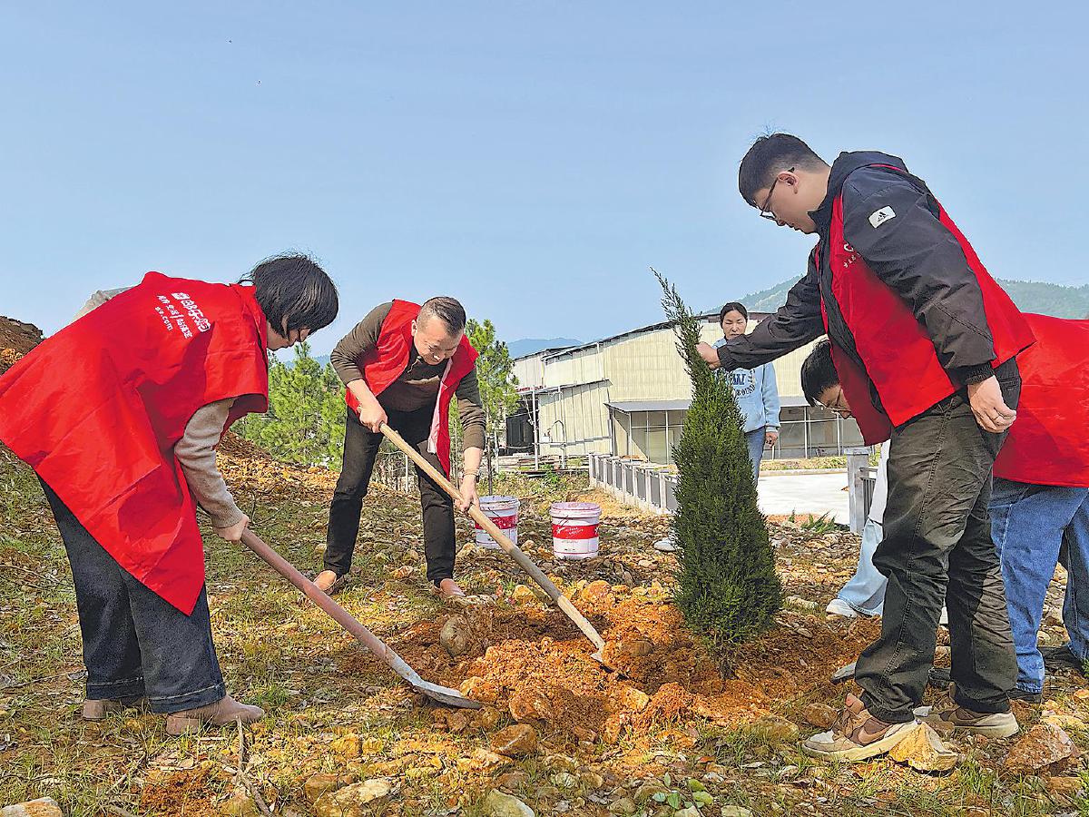 江西省吉安县邮政分公司与该县敖城镇伟凤粮食生产专业合作社携手开展植树节活动。双方员工与社员代表齐聚田间地头,挥锹铲土,以实际行动为美丽乡村建设增添新绿。□罗晶 摄影报道