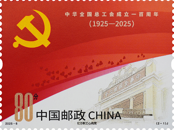 中国邮政定于2025年5月1日发行《中华全国总工会成立一百周年》纪念邮票1套2枚,邮票图案名称为:亿万职工心向党、团结奋斗新征程。全套邮票面值2.00元,计划发行数量570万套。