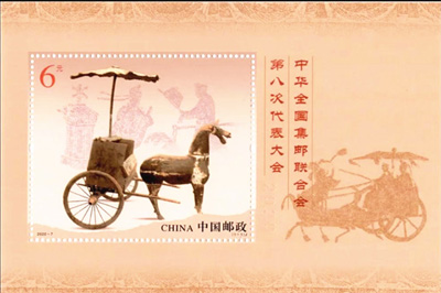 6月18日,中国邮政发行《中华全国集邮联合会第八次代表大会》纪念邮票(小型张)一套1枚。邮票图案以青海省博物馆馆藏汉代木轺车为主要表现元素,该文物在1977年夏季出土于青海省西宁市城西彭家寨汉墓。木轺车是我国古代官员及邮吏乘坐的一种交通工具,也可视为汉代邮政出行、运输工具的缩影。邮票边饰选取了沂南汉墓画像砖《迎宾图》中的局部,包含早期的桓表形象以及官员乘坐木轺车出行的场景,底色采用暖色系的色调加以衬托,突出展现了文物的历史悠远,也体现出中华全国集邮联合会第八次代表大会的庄重性。