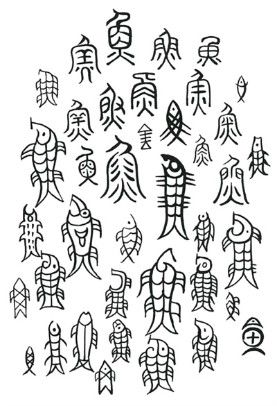 取材于古体汉字的鱼字。鱼字装饰图案与“一大”小型张雁阵图案边饰相呼应,寓意了鱼雁传书的佳话。